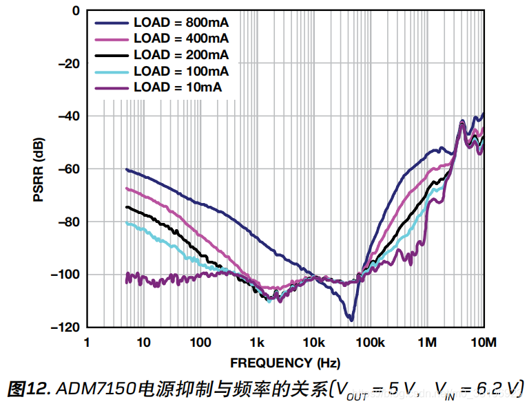 负载电流影响误差放大器反馈环路的增益带宽,因此也会影响PSRR。在低负载电流下(通常小于50 mA),调整元件的输出阻抗很高。