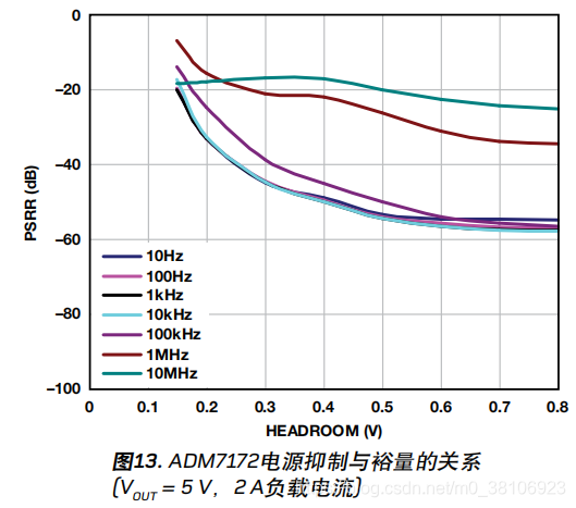 PSRR 也与输入到输出电压差(即裕量)有关。对于固定裕量电压,PSRR 随着负载电流的增加而降低;这在高负载电流和小裕量电压时尤其明显。图13 显示了5 V ADM7172 在2 A 负载下PSRR 与裕量电压之间的关系差异。