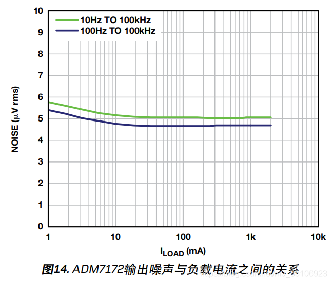 输出噪声电压是指在恒定输出电流和无纹波输入电压条件下,给定频率范围(通常为10 Hz 或100 Hz 至100 kHz)上的RMS 输出噪声电压。LDO 的主要输出噪声源是内部基准电压源和误差放大器。现代LDO 采用数十nA 的内部偏置电流工作,以便实现15μA或更低的静态电流。这些低偏置电流要求使用高达GΩ 级的偏置电阻。输出噪声的典型范围为5 μ V r ms 至100 μV rms。图14 显示了ADM7172 输出噪声与负载电流之间的关系。