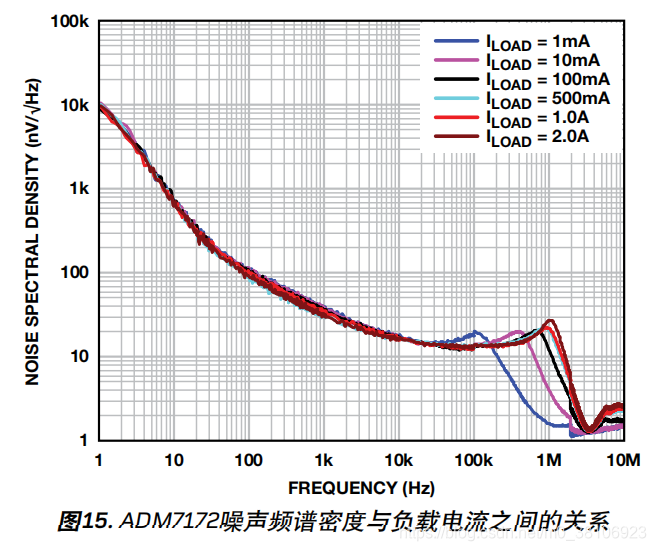 LDO 输出噪声的另一种表示方式是噪声频谱密度。在宽频率范围内绘制给定频率下1 Hz 带宽上的rms 噪声曲线图,然后使用该信息来计算给定频率带宽下的rms 噪声。图15 显示了ADM7172 在1 Hz 到10 MHz 范围内的噪声频谱密度。