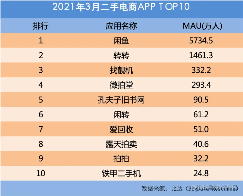 据阿里集团官方数据,闲鱼2020财年GMV超过2000亿元,卖家超过 3000万。比达数据的统计指出,在按月活计算的排行榜上,闲鱼2021年3月MAU以5734.5万人超过了后面九大平台之和,电商的经营根底让闲鱼遥遥领先。