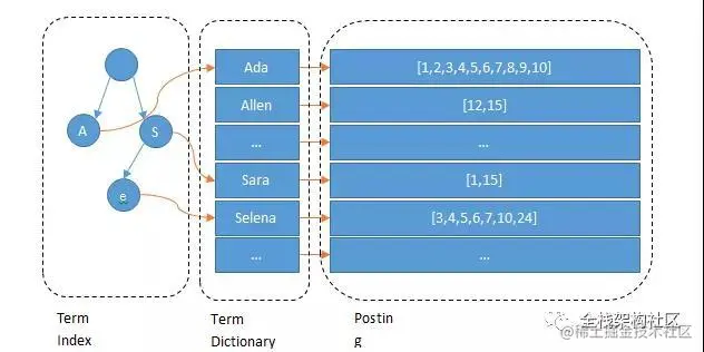 图中的 Ada、Sara 被称作 term,其实就是分词后的词了。如果把图中的 Term Index 去掉,是不是有点像 MySQL 了?Term Dictionary 就像二级索引,但 MySQL 是保存在磁盘上的,检索一个 term 需要若干次的 random access 磁盘操作。