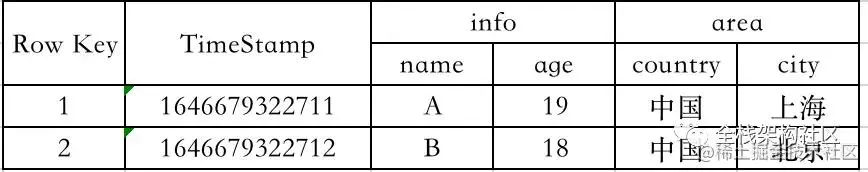 Row key 是主键,按照字典序排序。TimeStamp 是版本号。info 和 area 都是列簇(column Family),列簇将表进行横向切割。name、age 叫做列,属于某一个列簇,可进行动态添加。Cell 是具体的 Value 。