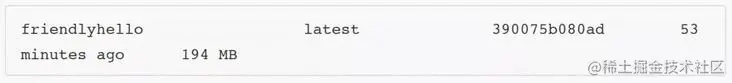 为举例需要,我参考 Docker 官方文档创建了一个名为 friendlyhello 的 Docker 镜像,该镜像大小为 194MB(如下所示):