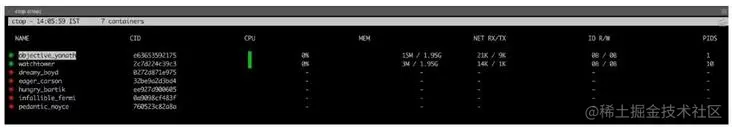 ctop 是一个简单的工具,对于了解在你的主机上运行的容器很有帮助。你可以在 ctop 文档中了解更多相关信息:github.com/bcicen/ctop…