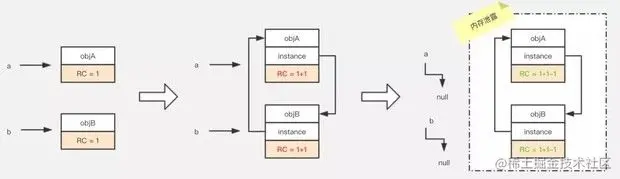我们可以看到,最后这2个对象已经不可能再被访问了,但由于他们相互引用着对方,导致它们的引用计数永远都不会为0,通过引用计数算法,也就永远无法通知GC收集器回收它们。
