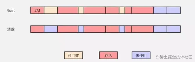 上图中等方块的假设是 2M,小一些的是 1M,大一些的是 4M。等我们回收完,内存就会切成了很多段。我们知道开辟内存空间时,需要的是连续的内存区域,这时候我们需要一个 2M的内存区域,其中有2个 1M 是没法用的。这样就导致,其实我们本身还有这么多的内存的,但却用不了。