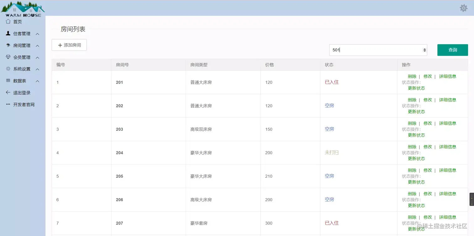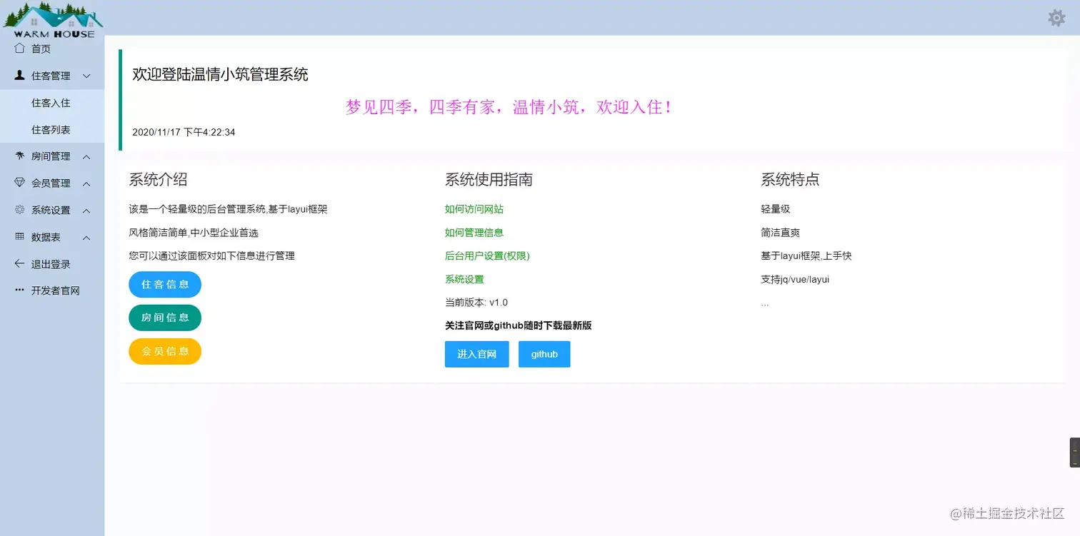 一个精简的基于SSM框架开发的酒店后台管理系统; 其主要功能包括对住客,房间和会员信息管理,同时可以下载房间和会员信息的数据; 前端实现采用了layui-Qadmin模板;整体简约大气,使用方便快捷,欢迎各大佬下载使用,或二次开发,如有不妥的地方还望请各大佬多提意见。