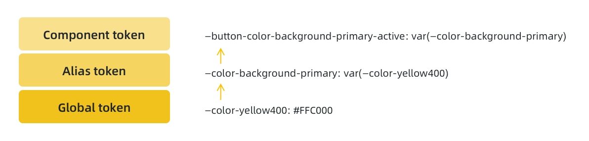 - Alias token, 是带有一定抽象语义的token, 比如color-background-primary, 即描述了该颜色用于主背景,但并没有说明具体用在什么组件。