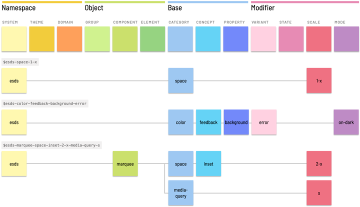 - Base 作为token的主干名,包括 类型category (color, font, spacing), 设计概念concept (feedback, action), 以及属性property (size, background)