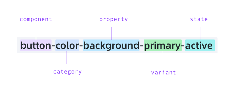 Token的命名规则应该是建设token体系时需要花最多时间讨论和思考的。因为一旦制定了一套命名规则,未来在任意场景中所有的样式属性都需要按照该方式进行编码命名。在我的项目中是按照如下方式对一个component token进行命名的,它很自然的描述了该token的使用场景,无须查看文档就已经知道这是用于active状态下的一级按钮背景色。当然每个人可以根据自己项目最适合的开发场景来定义token的命名。