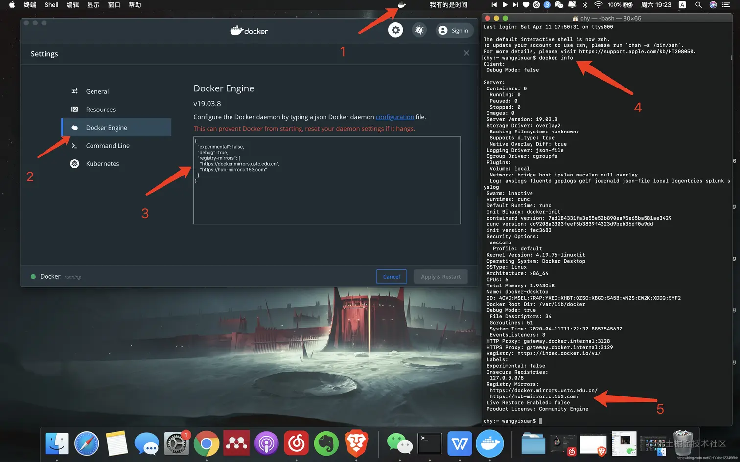 MAC版 的最新Docker 2.2版本配置国内代理的解决办法 草莓味的棉花糖 2021-07-08 206 阅读1分钟 点击Docker图标,选择Preference选项,进行国内代理的问题 输入内容如下 { "experimental": false, "debug": true, "registry-mirrors": [ "https://docker.mirrors.ustc.edu.cn", "https://hub-mirror.c.163.com" ] } 在终端进行验证 docker info