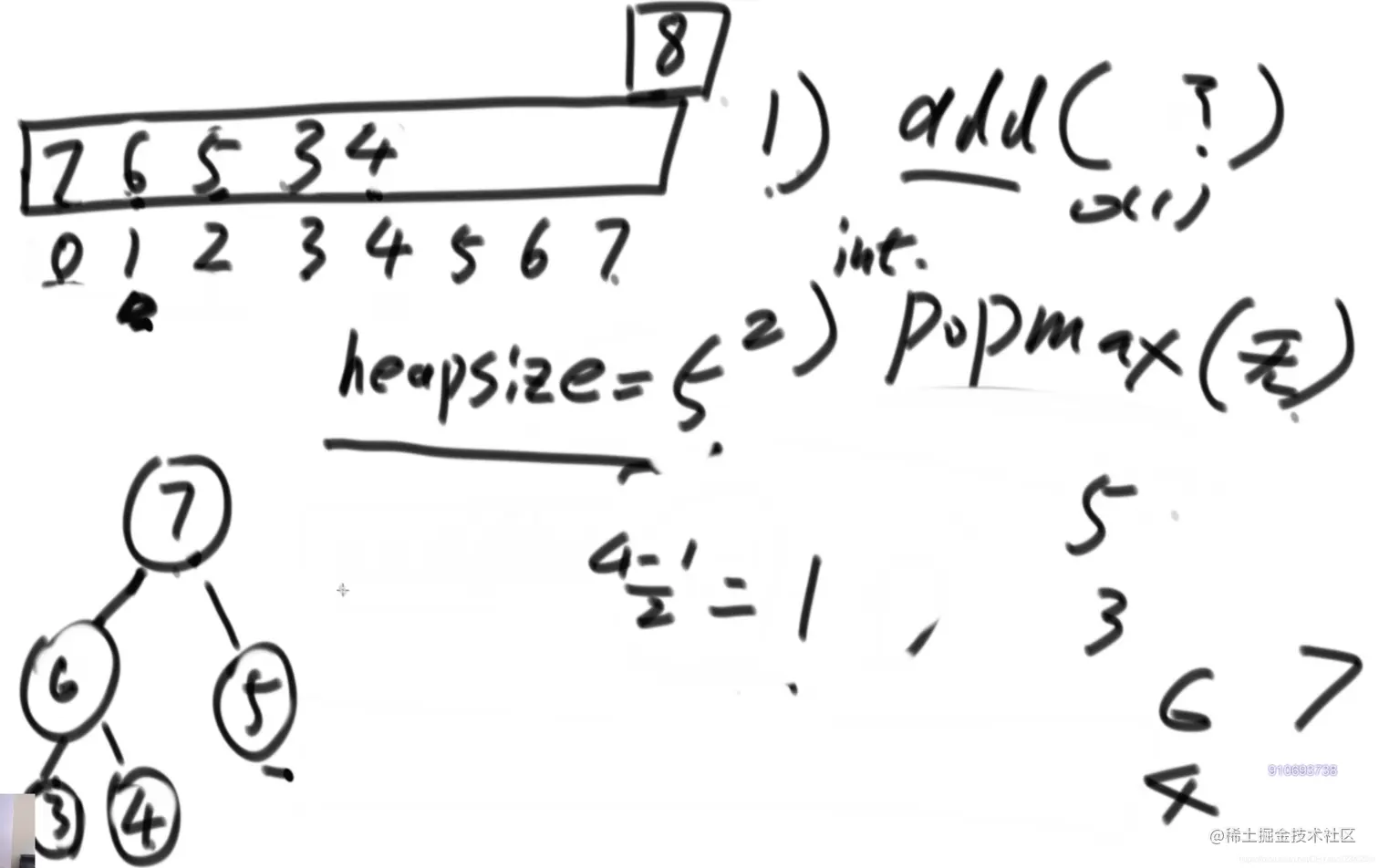 - 加入元素:数组下标从0到7,按照输入的顺序加入到数组中,没加入一个数组根据公式(i-1)/ 2来判定,他的父节点的位置,然后与父节点做比较,如果大于父节点则和父节点的位置交换。每加入一个元素,那么heapsize+1。heapsize用于指定堆的大小。