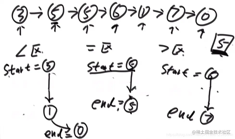 - 2,保证稳定性:根据题目要求设置三个区,小于区、等于区和大于区,每个区间包含两个变量,开始节点和结尾节点,一共设置6个变量,6个变量都指向null;当遇到第一个元素3的时候,它是小于指定元素5的,将小于区域的开始和结束指针都指向3;第二个元素是5,属于等于区,让等于区的start和end都指向第二个元素5;第3个元素也是5,让等于区的end只想第三个元素。以此类推,得到上面的结果。最后将小于区域的end指针链接等于区域的start指针,等于区域的end指针链接大于区域的start指针。需要注意的是,有可能上面6个变量有不存在的情形,需要仔细判别。