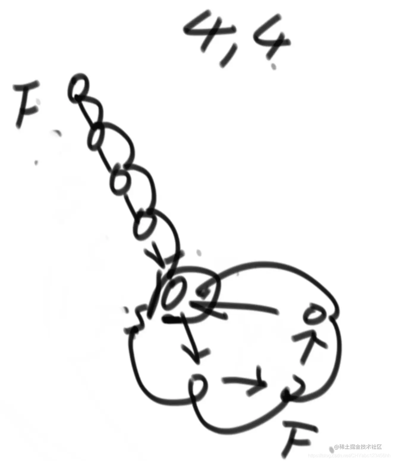 - 使用快慢指针来做,快指针每次移动俩个位置,慢指针每次移动一个位置,当快慢指针第一次相交之后,快指针回到链表的起始点,慢指针呆在原地不动。然后快指针和慢指针都每次移动一个位置,当他们再次相遇之后,相遇的元素就是入环的第一个元素,且能证明这个链表是有环的结构。上图所示的是环外4个点,环内4个点,可以按照这个流程走一遍。