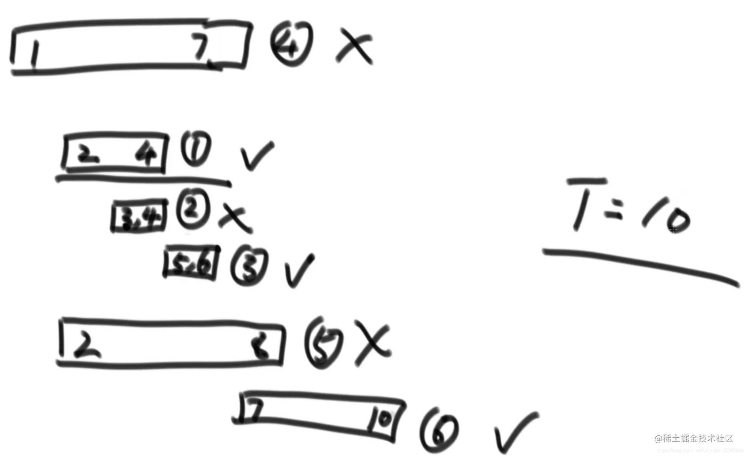 - 按照结束时间早的会议先安排,比如先安排【2,4】,当4结束了,所有开始时间小于4的全部淘汰,【1,7】、【3,4】,【2,8】,将【5,6】加入安排,将【7,10】加入安排