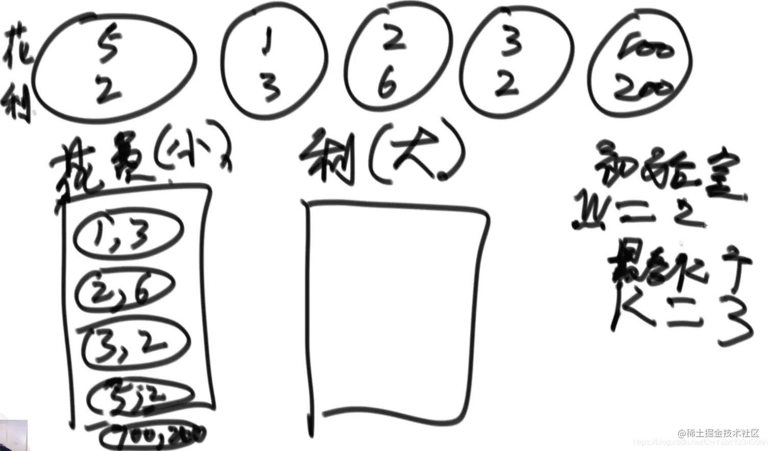 - 按照花费的钱建立小根堆,这个是被锁定的状态,根据初始的钱,比如w=2,解锁(1,3)和(2,6) ,按照利润的高低,压入利润大根堆中,(2,6)(1,3)加入栈中,然后将其从小根堆中删除。然后做第一个项目(2,6),此时自己的钱数为8,那么将小于8的花费的项目解锁,以此类推。