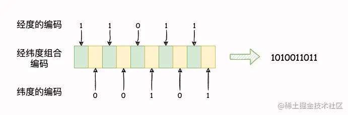 假如计算的经纬度编码分别是 11011 和 00101`,目标编码第 0 位则从经度第 0 位的值 1 作为目标值,目标编码的第 1 位则从纬度第 0 位值 0 作为目标值,以此类推: