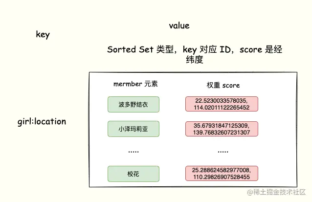 比如,Sorted Set 的元素是「女神ID」,元素对应的权重 score 是经纬度信息。