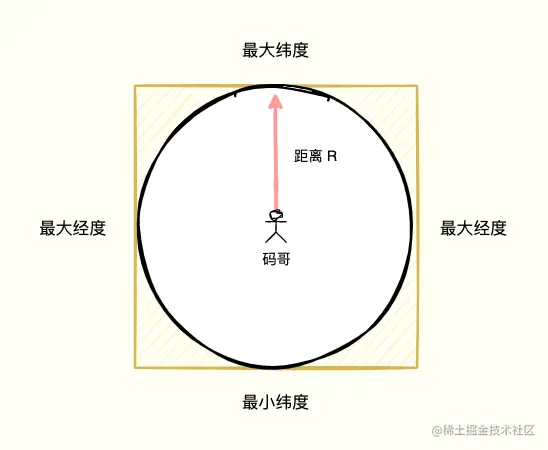 在圆形外套上一个正方形,根据用户经、纬度的最大最小值(经、纬度 + 距离),作为筛选条件过滤数据,就很容易将正方形内的「女神」信息搜索出来。
