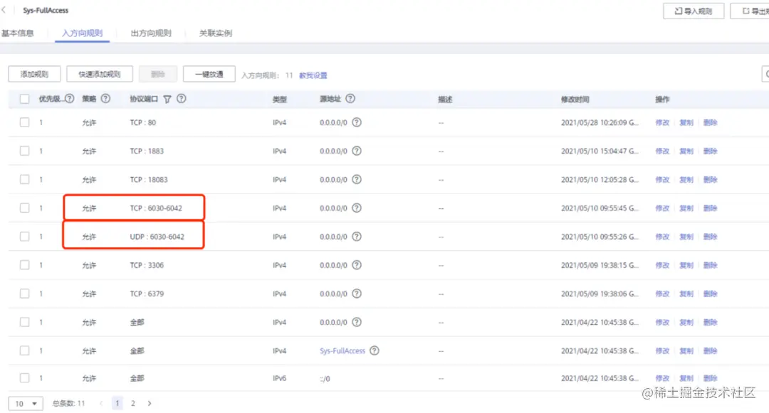 对于云服务器出现的外网连接问题,我们的第一反应其实就是安全组的端口策略配置。所以,我们先让用户登陆了集群节点所在的华为云后台,并发来安全组配置的截图。在确认了安全组策略没问题之后,我们才开始了其他操作。