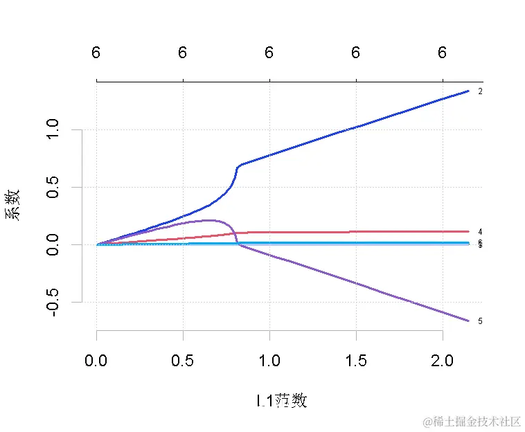 图中显示了随着lambda的变化,模型系数对整个系数向量的L1-norm的路径。上面的轴表示在当前lambda下非零系数的数量,这也是lasso的有效自由度(df)。