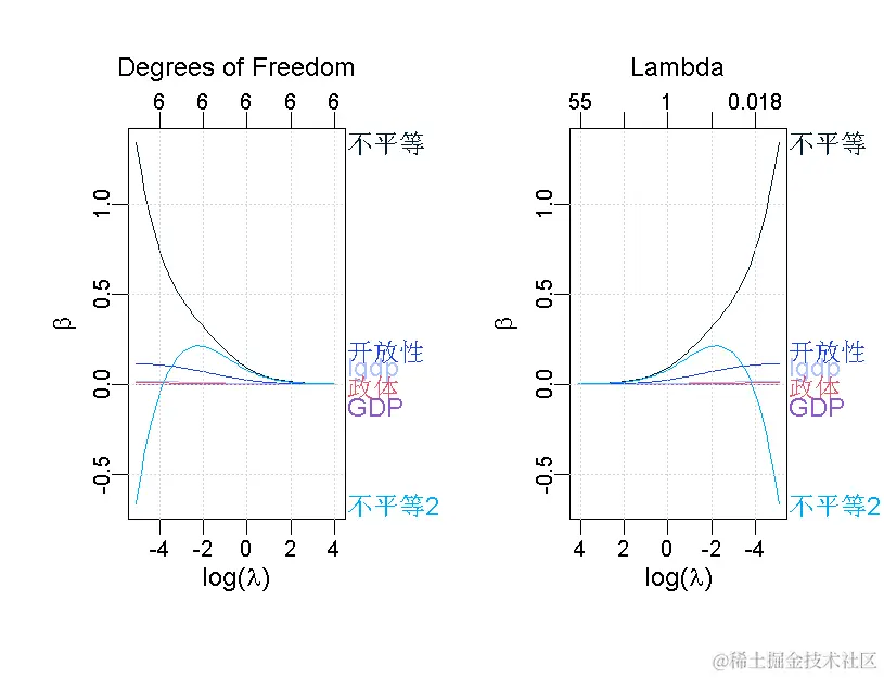 plot_glmnet(ridge_glmnet.fit, xvar = "lambda", label=6, xlab = expression(paste("log(", lambda, ")")), ylab = expression(beta)) # "标签"是指你想让图表显示的前N个变量。
