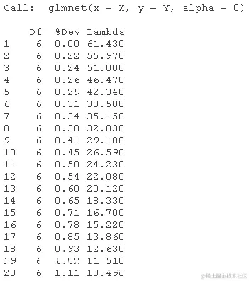 #检查glmnet模型的输出(注意我们拟合了一个岭回归模型