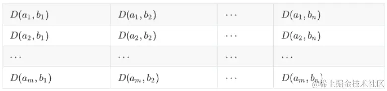 2. 然后用欧式距离计算出每序列的每两点之间的距离,D(ai,bj) 其中1≤i≤m,1≤j≤n