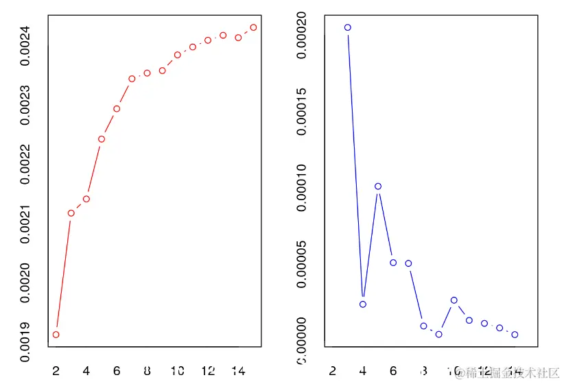 在休伯特指数图中,我们寻找一个明显的拐点,对应于测量值的明显增加,即休伯特指数第二差值图中的明显峰值。
