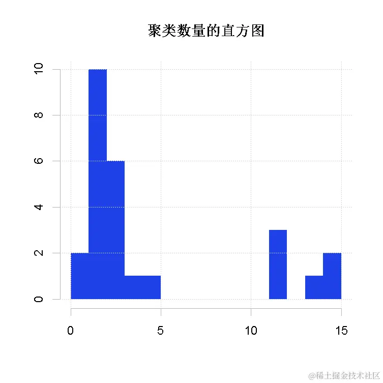 直方图,断点=15,因为我们的算法是检查2到15个聚类的。