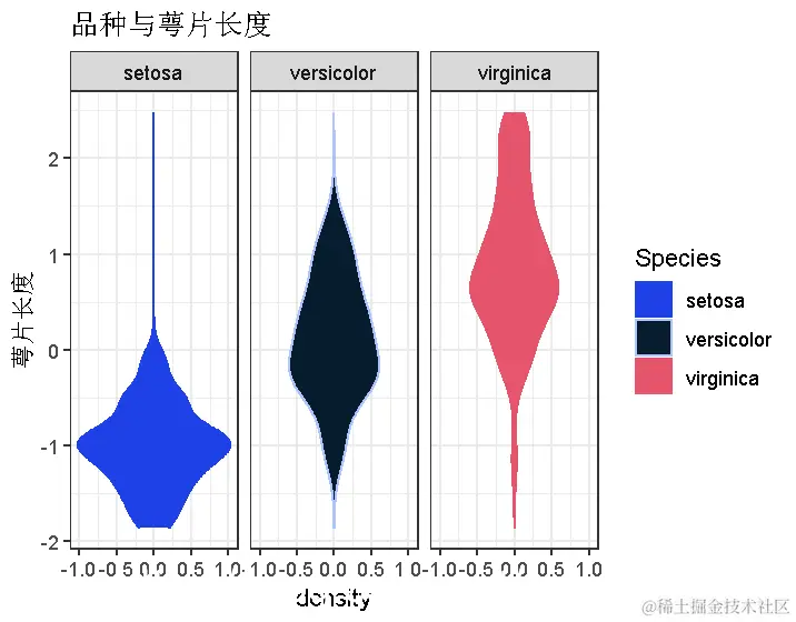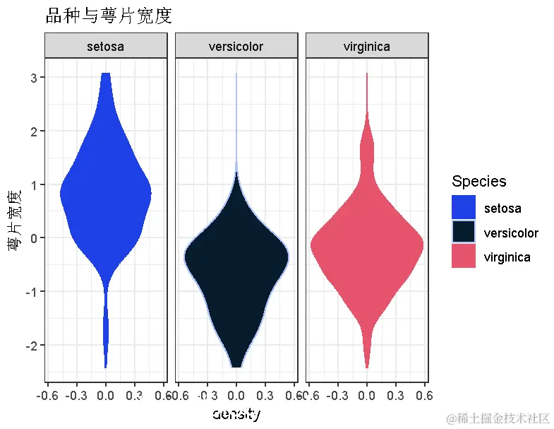 plot( iris, stat_density(aes(ymax = ..density.., ymin = -..density..,