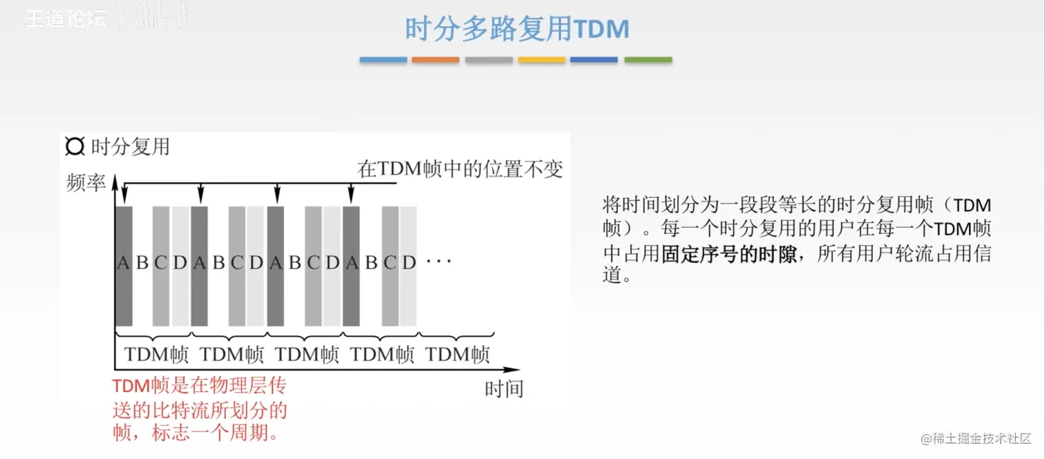 - 时分复用,如果A、B、和C都不发送数据,只有D发送数据,类似D的时间片用完,会等待时间,等A、B和C用完,即使他们不发送数据,造成了利用率低下