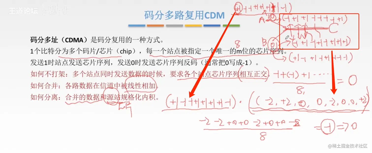 - 相互正交,规格内积画是0;也就是A和B的1或者0 对应位数相乘在相加除以总的位数,如果结果是0,就表明相互正交,双方就可以发送同时发送数据不会产生数据干扰