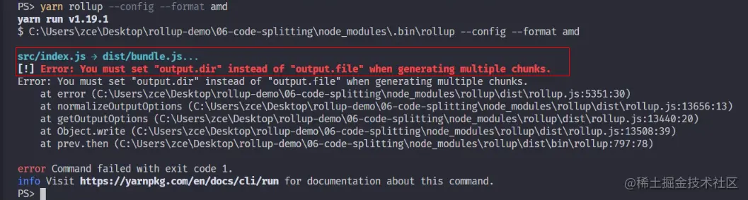=> 错误信息: 使用代码拆分方式打包时不能使用 output.file 的方式 -> 因为需要输出多个文件 file 这种方式是指定单个文件输出的输出文件名 -> 如果需要输出多个参数 需要使用 dir 的参数