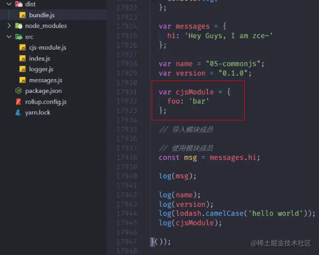 通过命令行 Rollup 打包(yarn rollup --config) -> 此时 Lodash-es 所对应的代码就被可以打包到 bundle.js 中 -> 这里使用 lodash ESM 版本 而不是使用 lodash 普通版本的原因是因为: Rollup 默认只能够处理 ESM 模块 如果要使用普通版本 需要做额外的处理