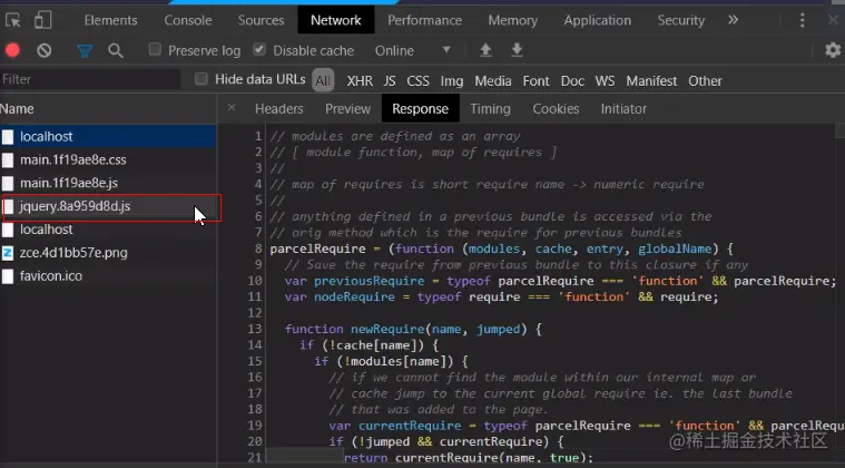保存后回到浏览器 -> 在开发人员工具中的 Network 中就会找到 刚刚拆分出来的 jqury 所对应的 bundle.js 的请求