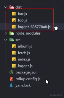 // rollup.config.jsexport default { // input: ['src/index.js', 'src/album.js'] input: { foo: 'src/index.js', bar: 'src/album.js' }, output: { dir: 'dist', format: 'amd' }}