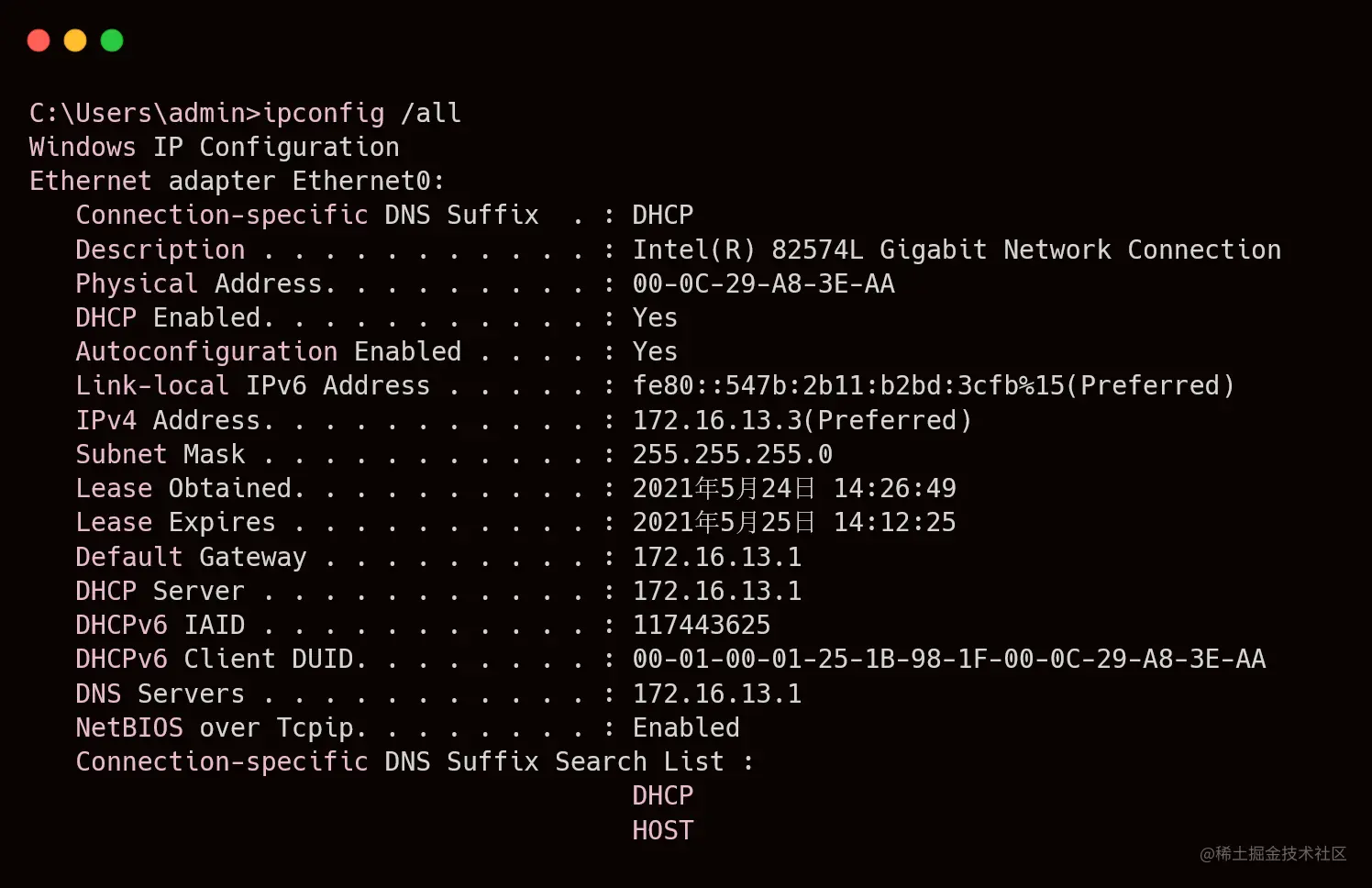 Windows系统下,ipconfig加上/all参数,可查看本机的IP地址、掩码、默认网关、DHCP和DNS服务器等信息。Linux或Mac系统下,请使用ifconfig命令代替。