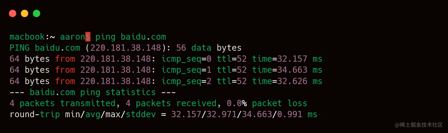 macbook:~ aaron$ ping baidu.com PING baidu.com (220.181.38.148): 56 data bytes 64 bytes from 220.181.38.148: icmp_seq=0 ttl=52 time=32.157 ms 64 bytes from 220.181.38.148: icmp_seq=1 ttl=52 time=34.663 ms 64 bytes from 220.181.38.148: icmp_seq=2 ttl=52 time=32.626 ms --- baidu.com ping statistics --- 4 packets transmitted, 4 packets received, 0.0% packet loss round-trip min/avg/max/stddev = 32.157/32.971/34.663/0.991 ms