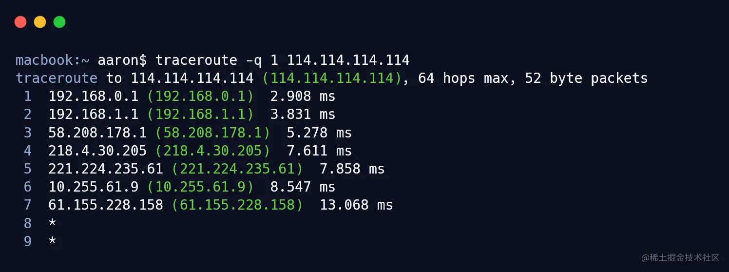 macbook:~ aaron$ traceroute -q 1 114.114.114.114