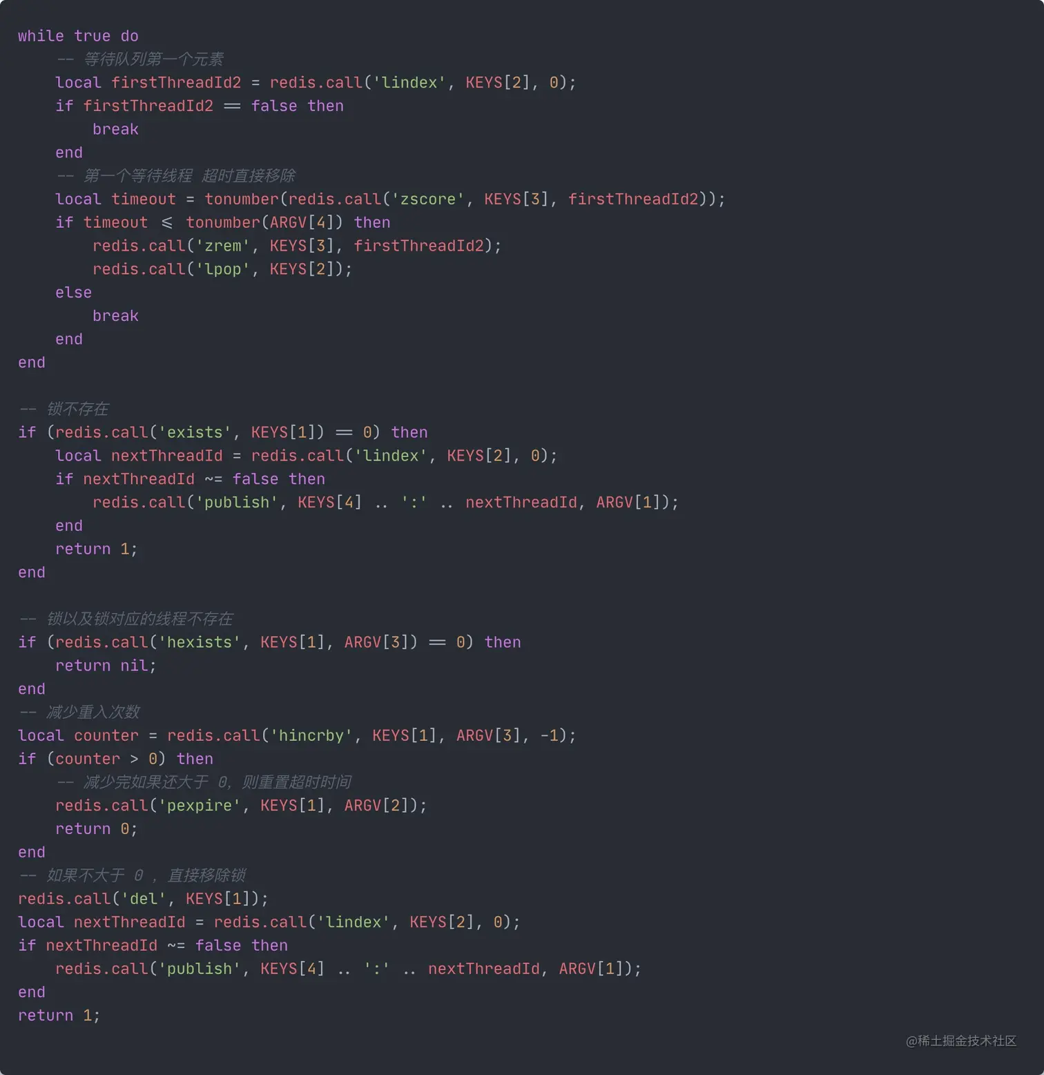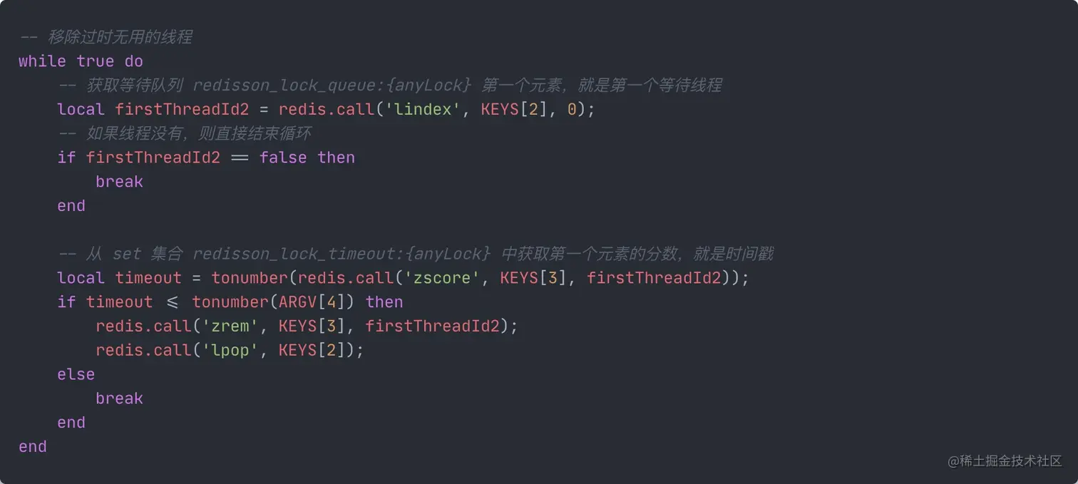 在加锁和释放锁的 lua 脚本中,第一段永远是一个 while true do xxx,作用就是用来移除队列中超时的锁。