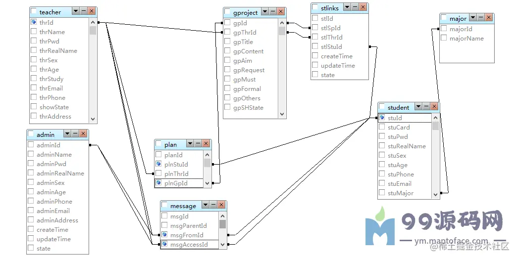 毕业论文选题系统数据库应包含的数据表主要有: 系统管理员表、 管理员组权限表、专业信息表、 教师信息表、 学生信息表、课题进度表、 课题信息表、选题信息表、消息表,各表之间的约束关系如图所示: