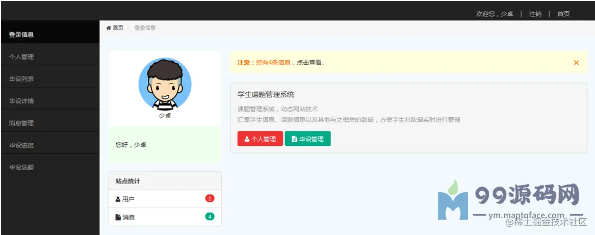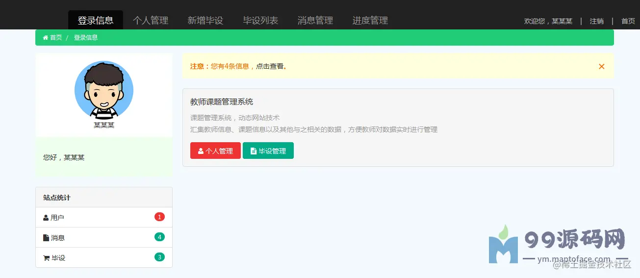 教师模块主要页面有个人管理、新增课题、课题列表管理、消息管理、进度列表管理。