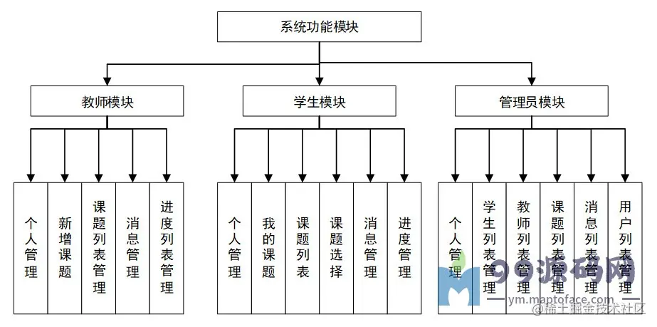 毕业设计选题环节中,系统管理员的需求为:学生管理(新增学生、删除学生及学生登录系统数据的初始化操作)、教师管理(新增教师、删除教师及教师系统登录数据的初始化操作)、课题管理(对教师新提交课题进行审核处理、对违规课题进行删除操作)、用户管理(新增各权限级的管理员、删除管理员、对子集权限组管理员系统登录数据的初始化操作)以及消息通知(发布不同对象的系统消息、对所有消息进行查看及删除操作)。