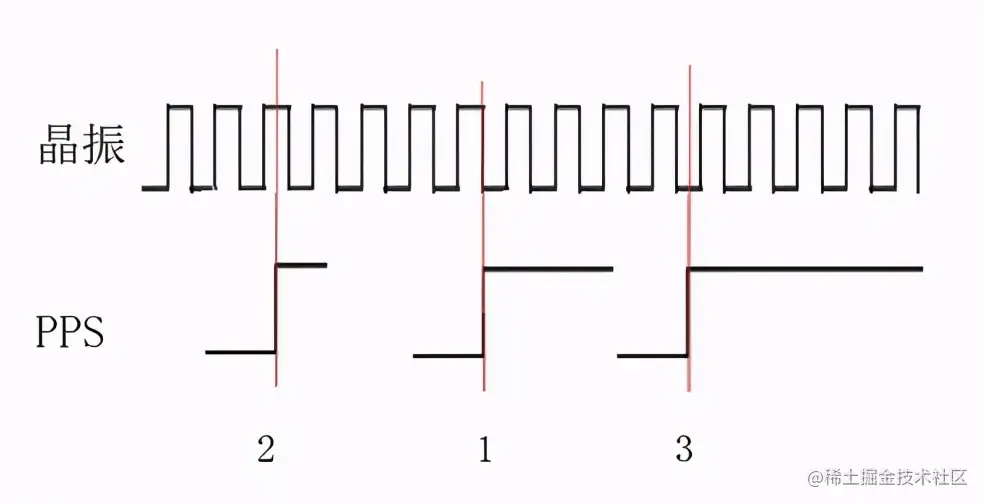 (1)PPS上升沿与晶振时钟对齐,此为理想状态,是晶振经分频、倍频后为MCU系统时间提供了完美的1秒时长,但这种情况几乎不存在。