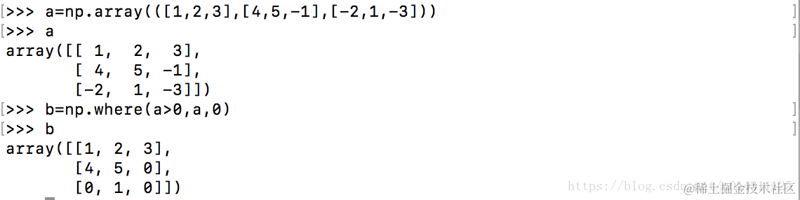 例如通过where()函数将a数组中负值设为0,正值不变