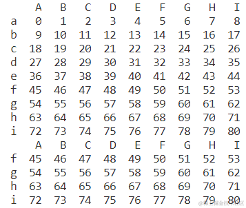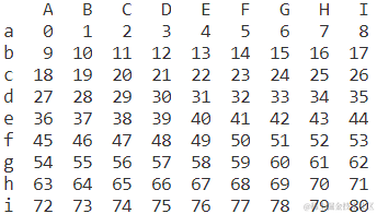 e =pd.DataFrame(np.arange(81).reshape(9,9),index=list('abcdefghi'),columns=list('ABCDEFGHI'))