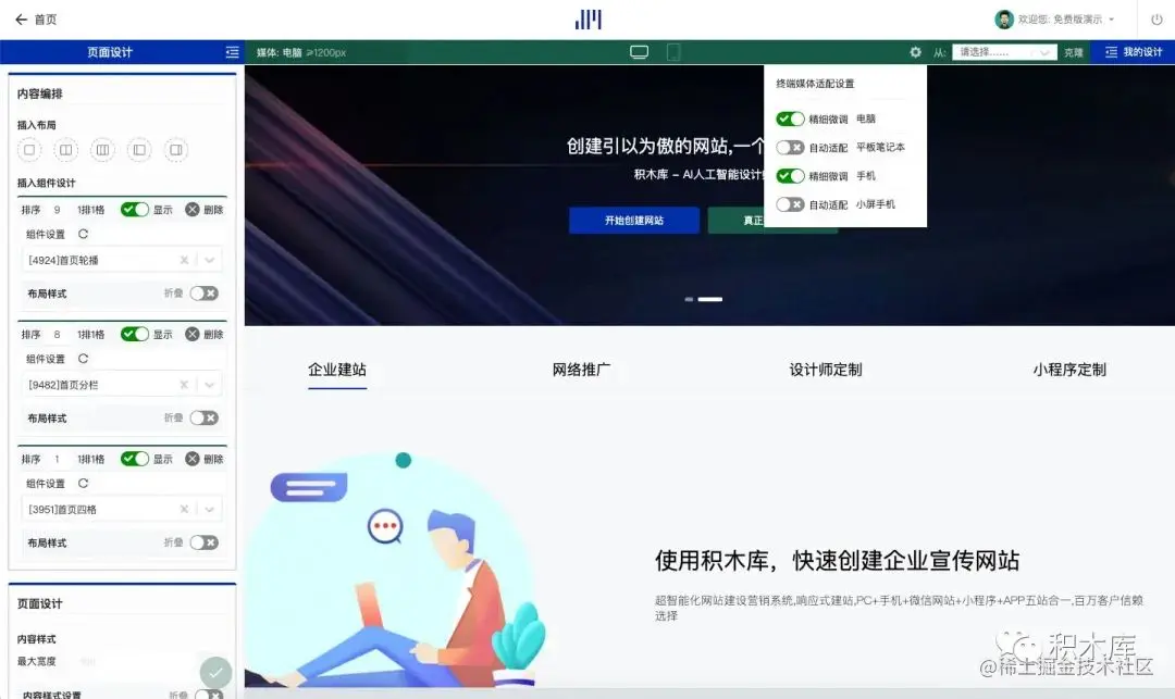 通过技术上的创新突破,让普通人也能轻松创建网站,还推出免费版本降低成本,在吸引懂些设计能P图普通用户和忠实粉丝的基础上,推出功能更强大,更漂亮的组件,使需求较高的用户升级版本,这或许就是积木库在所谓的模板建站市场的一次技术上的突破。