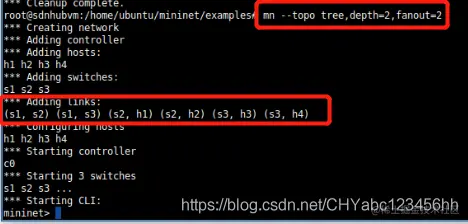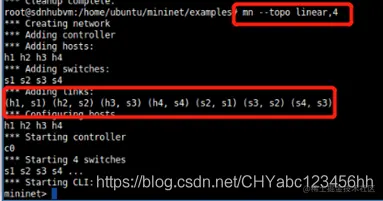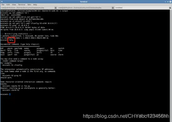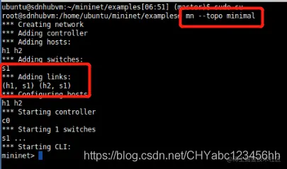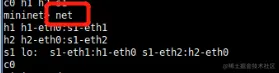 - 终端输入mn,可以创建一个简单的网络,创建完成之后,命令行变为mininet>